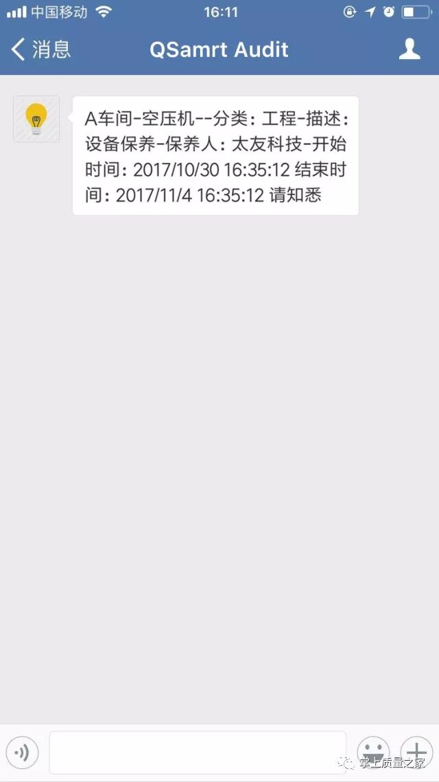 管理员在QSmart Audit手机巡检APP上发布巡检任务,巡检员微信即可收到任务提醒。